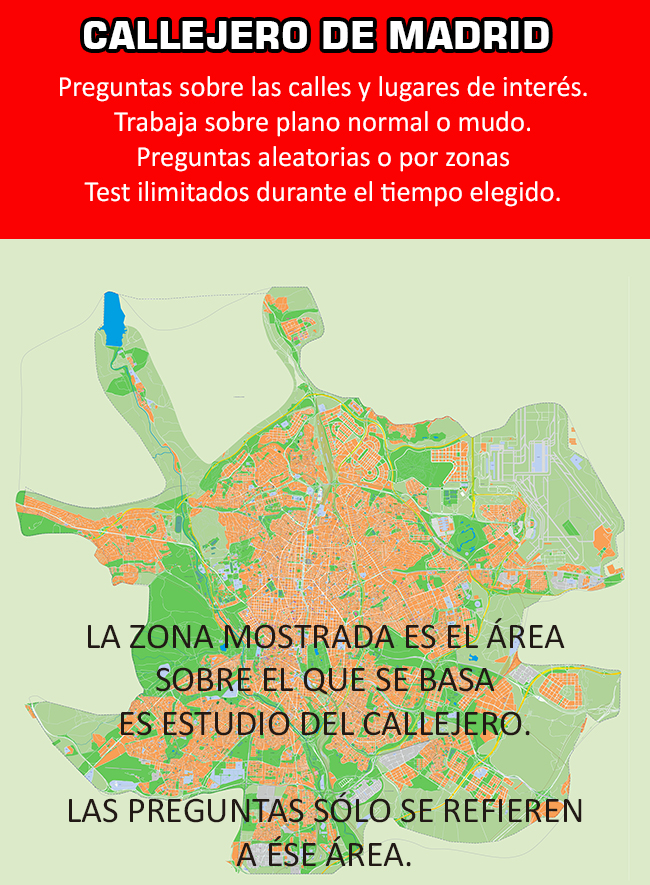 Podrás realizar tu repaso o estudio del callejero sobre plano normal con calles o sobre plano mudo, aleatorio, distritos o barrios. Aproximadamente, 18205 preguntas disponibles.