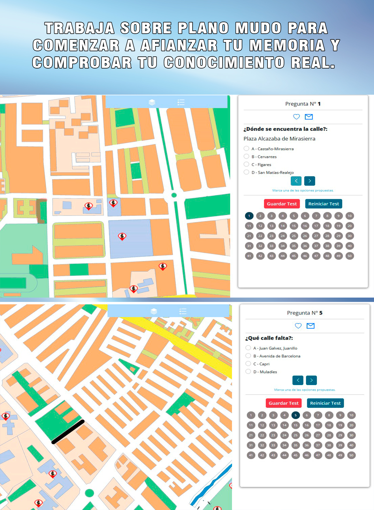 Podrás generar todos los test sobre calles y lugares de interés que quieras, sin límite.